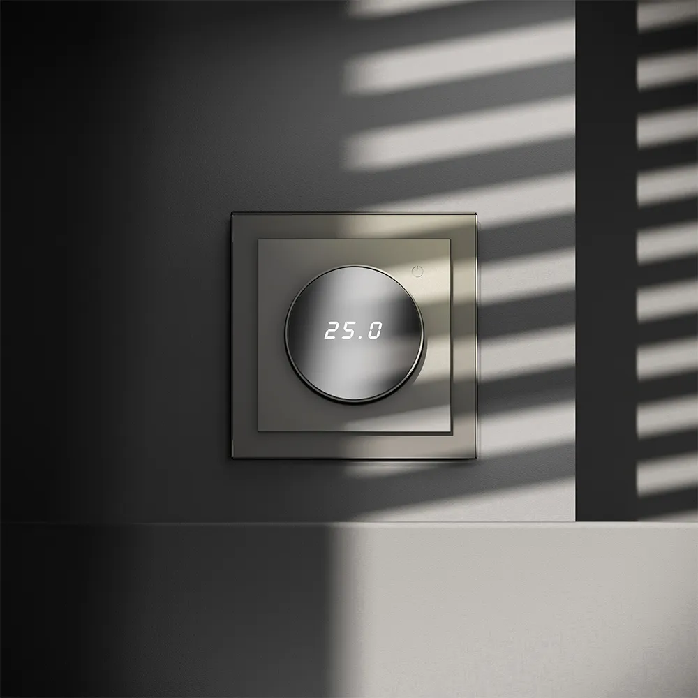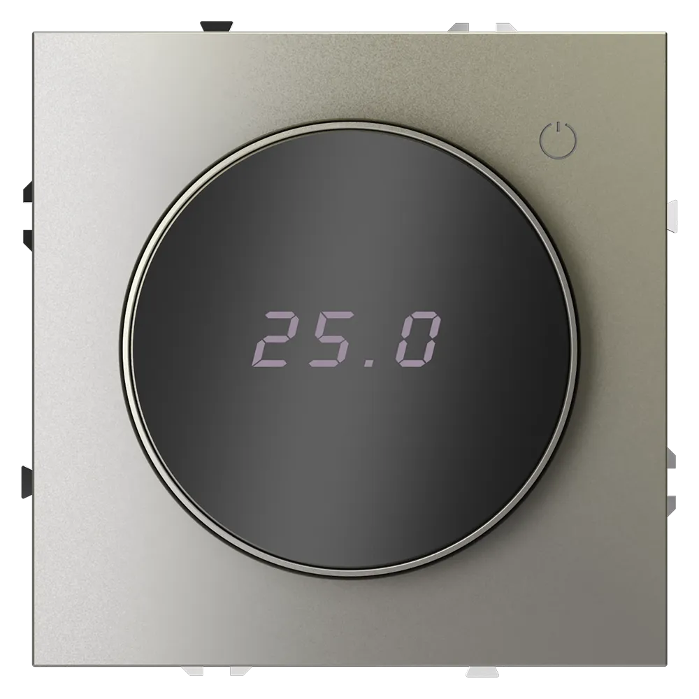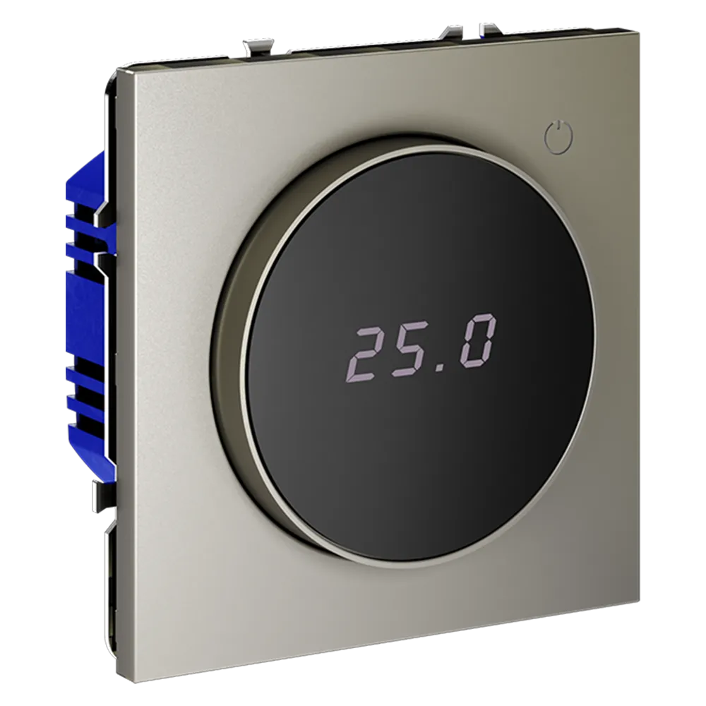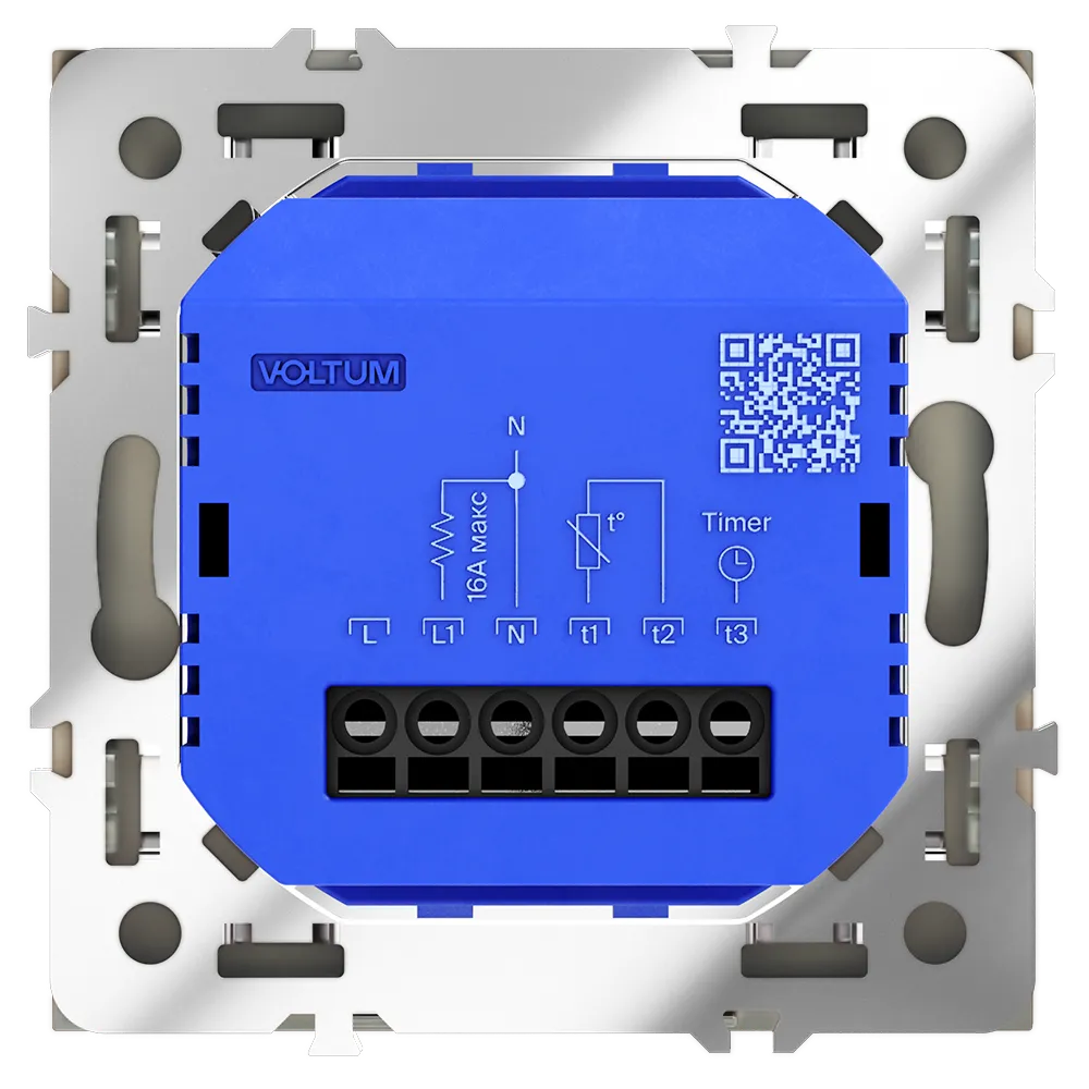 Место установки. Терморегуляторы Voltum предназначены для регулирования температуры электрического теплого пола. Актуальны как в городских квартирах, так и в загородных дачных домах без центрального отопления. Корпус. Дизайн терморегуляторов Voltum сочетается со стилем остальных электрических устройств компании. Они совместимы со всеми рамками. Материал внешних декоративных элементов — поликарбонат. Конструктивные особенности. Терморегуляторы работают с любыми типами теплых полов и рассчитаны на нагрузку до 3500 Вт. Устройства оснащены светодиодной индикацией режима и дисплеем, на котором отображается температура поверхности пола. Красный индикатор — «подача питания на нагревательный кабель (идет процесс нагрева)», отсутствие индикации — «заданная температура достигнута». В течение 15 минут после нагрева терморегулятор переходит в интеллектуальный «спящий режим», уменьшая яркость подсветки цифр и сокращая энергопотребление. Регулировка осуществляется вращением панели управления. Терморегулятор поставляется в комплекте с механизмом из пластиковой накладки и датчиком температуры.