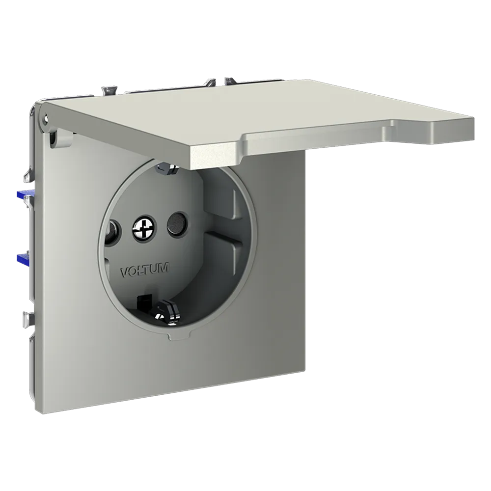 Благодаря степени защиты IP40 и наличию крышки, розетка надёжно защищена от проникновения твёрдых частиц и брызг воды, а встроенные шторки предотвращают доступ детей к контактам. Это делает изделие одним из самых безопасных в линейке Voltum.